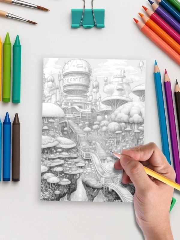 100 creative pages blending fairies with futuristic homes, gadgets, and glowing environments.